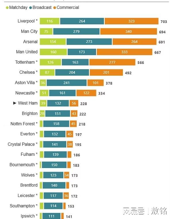 评价:因为没踢欧冠,踢的是欧联,转播权收入锐减,其转播权收入几乎比曼城少了1亿英镑。但曼联作为老牌劲旅,全球影响力还是相当可以,这体现在商业赞助的规模上。拉特克里夫的精兵简政收到成效,球员工资支出大幅下降。