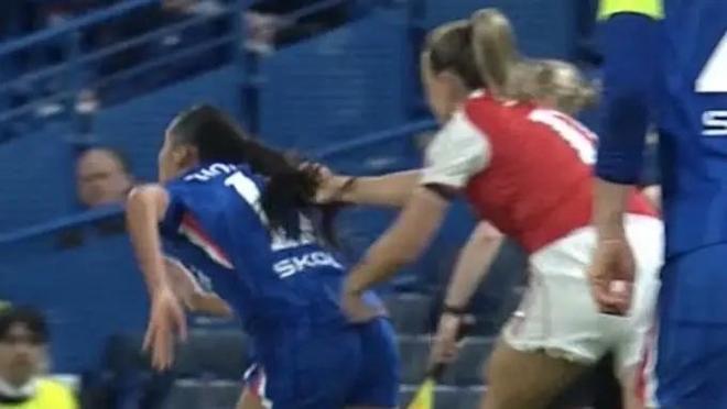 在北京时间今天凌晨进行的女足欧冠1/4决赛中,切尔西女足1-0战胜阿森纳女足,但总比分2-3遭到淘汰。比赛中出现了争议一幕,阿森纳女足球员麦凯布拉拽切尔西女足球员阿莉莎-汤普森的辫子,但裁判却无视了这次够得上红牌的犯规。