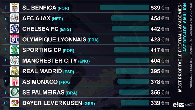 近日,瑞士体育研究机构足球天文台(CIES)发布过去十年最赚钱的青训体系,本菲卡以5.89亿欧元高居榜首,阿贾克斯、切尔西分列二三。