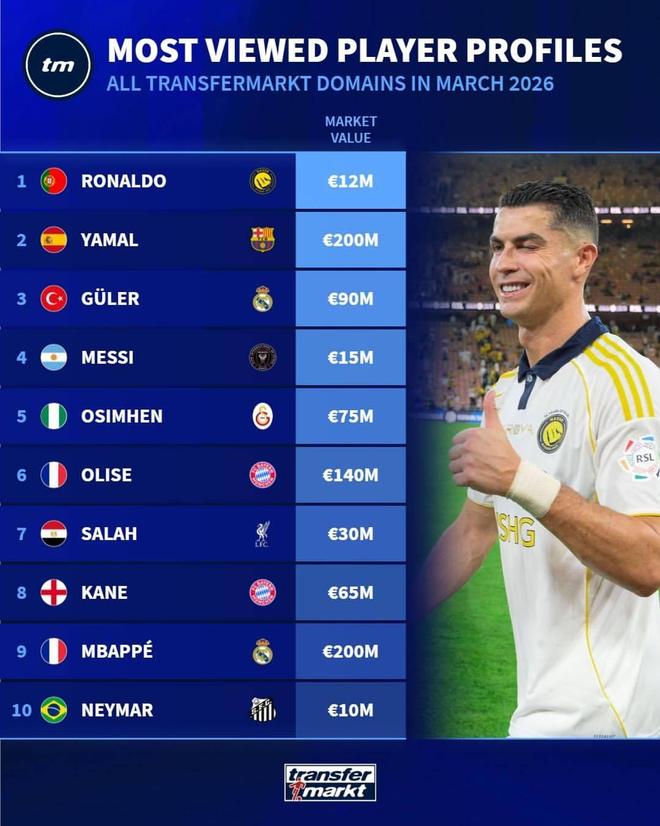 北京时间4月3日,德转发布3月球员页面浏览量排名,C罗位居第一,亚马尔、居莱尔分列二三,梅西第四。