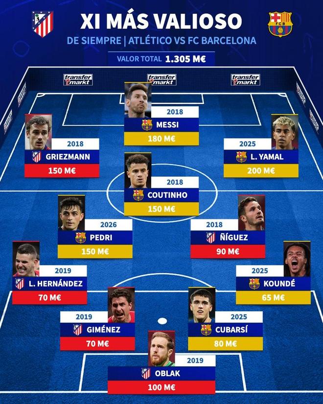 北京时间4月5日,在西甲第30轮马德里竞技和巴塞罗那迎来正面对话的情况下,德转列出了两队历史身价最高的11人阵容,梅西、亚马尔领衔,格列兹曼、奥布拉克在列。