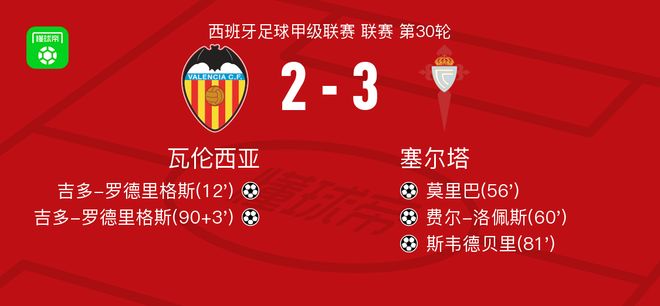 北京时间4月5日西班牙足球甲级联赛 联赛 第30轮,瓦伦西亚主场对阵塞尔塔。瓦伦西亚吉多-罗德里格斯梅开二度。塞尔塔莫里巴破门,费尔-洛佩斯破门,斯韦德贝里破门。最终比分瓦伦西亚 2-3 塞尔塔。