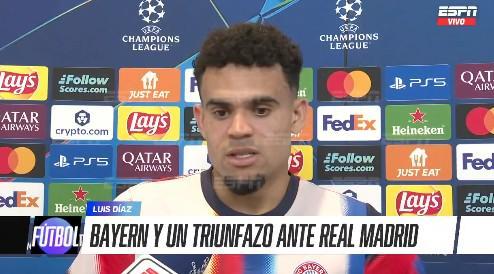 欧冠1/4决赛首回合,拜仁2-1战胜皇马,打入1粒进球的拜仁前锋路易斯-迪亚斯赛后接受了ESPN的采访。
