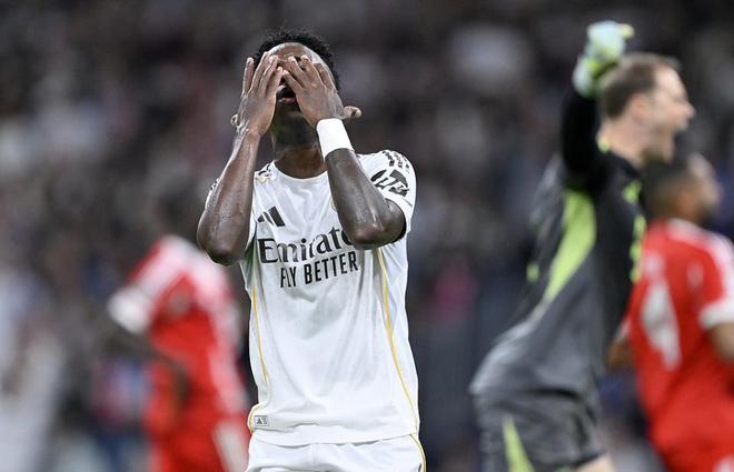 第61分钟,他错失了自己全场最佳的好机会。当时拜仁中卫于帕梅卡诺头球回传失误送礼,维尼修斯千载难逢的单刀机会,却在面对40岁的老门将诺伊尔时打偏。