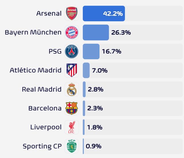 本赛季欧冠,8支球队的夺冠概率如何?OPTA经过大数据模拟推演,给出预测: