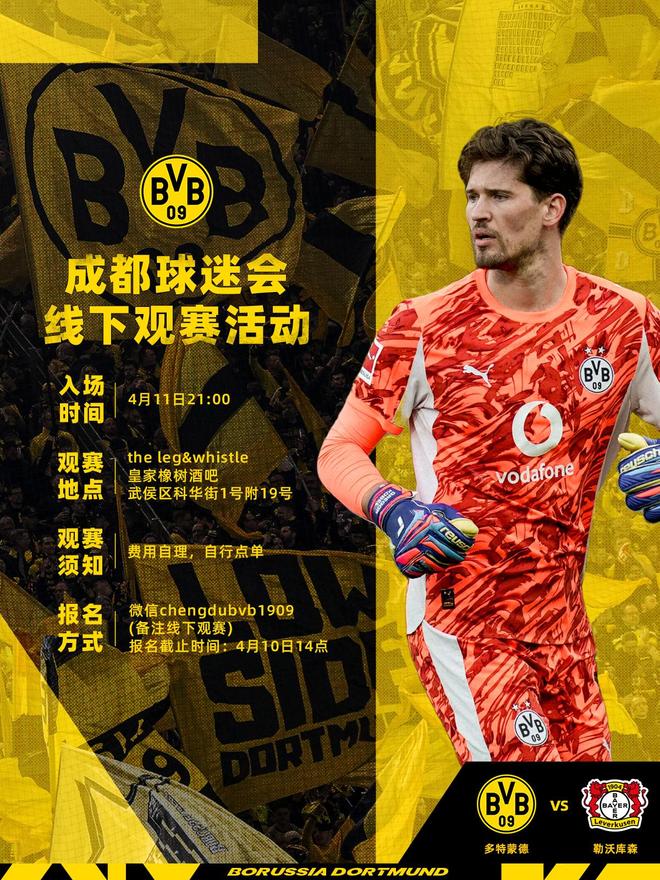北京时间4月9日,据多特蒙德官方微博消息,多特将在成都举行线下观赛活动,地点在皇家橡树酒吧。