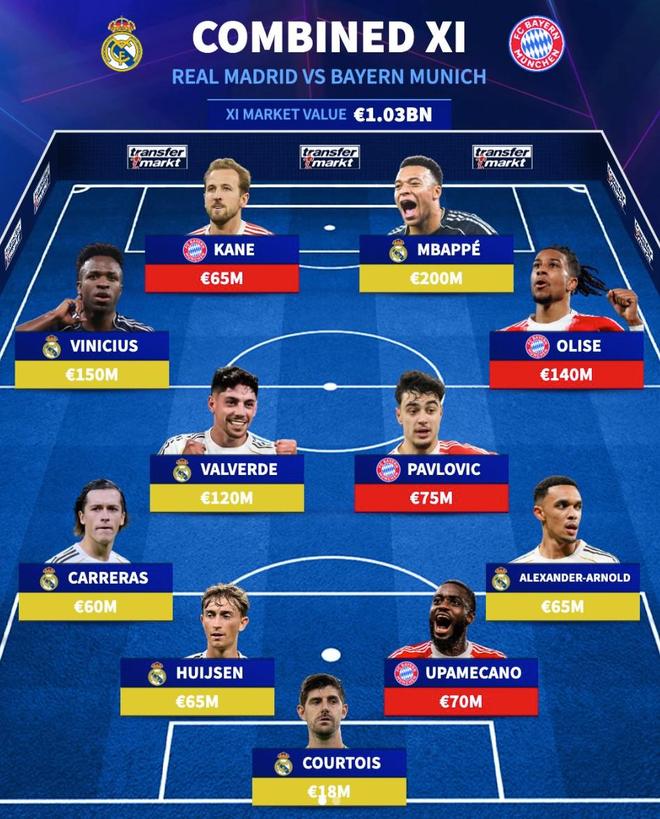 北京时间4月7日,在欧冠1/4决赛首回合皇家马德里主场与拜仁慕尼黑的焦点战即将打响的情况下,德转列出了两支球队目前身价最高的11人阵容,皇马7人入选,姆巴佩2亿欧元领衔,拜仁占据4席。