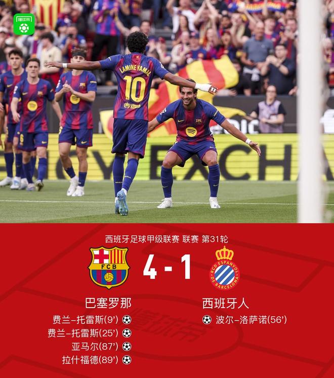 北京时间4月12日西班牙足球甲级联赛 第31轮,巴塞罗那主场对阵西班牙人。上半场,亚马尔角球开出,费兰头球破门,先下一城,随后,亚马尔外脚背再次助攻,费兰低射破门,上演梅开二度,下半场,洛萨诺远射扳回一城,随后,亚马尔、德容先后破门,锁定胜局。最终比分巴萨 4-1 西班牙人。