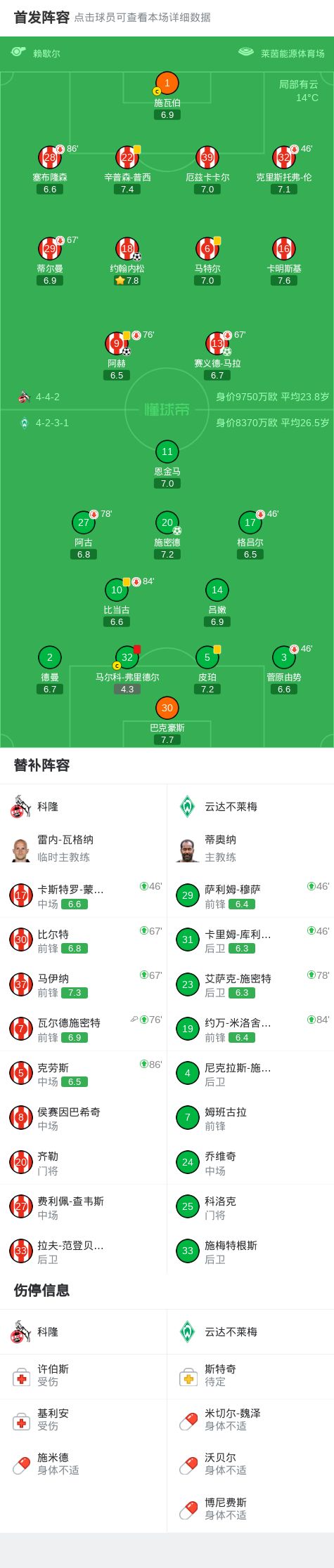 北京时间4月12日德国足球顶级联赛 联赛 第29轮,科隆主场对阵云达不莱梅。科隆赛义德-马拉破门,阿赫破门,约翰内松破门。云达不莱梅施密德破门。最终比分科隆 3-1 云达不莱梅。