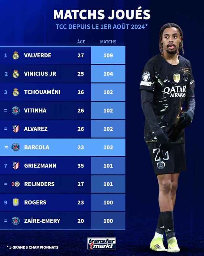 9. 扎伊尔-埃梅里(巴黎圣日耳曼)20岁 100场