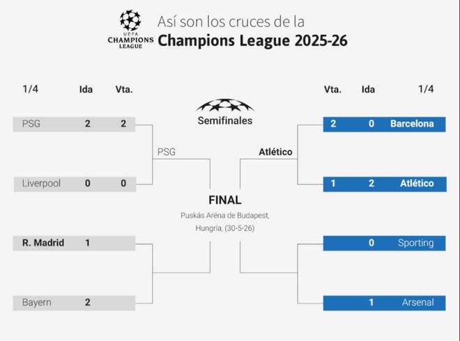 根据欧冠赛程安排,半决赛中,巴黎圣日耳曼将对阵拜仁慕尼黑与皇家马德里之间的胜者,马德里竞技将对阵阿森纳与葡萄牙体育之间的胜者。