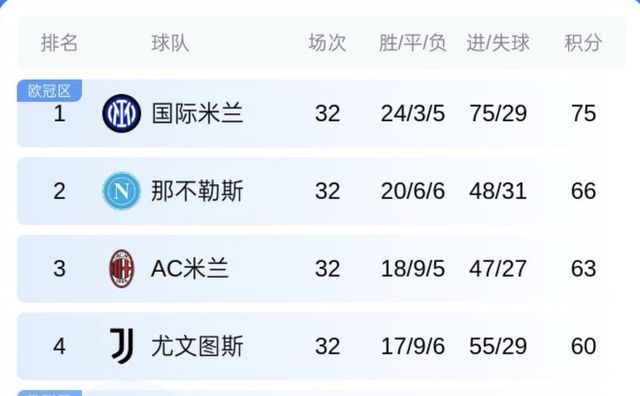 本轮意甲,国米4-3逆转科莫,早些结束的那不勒斯1-1帕尔马。最新积分榜,国米剩余6轮以9分优势领跑!
