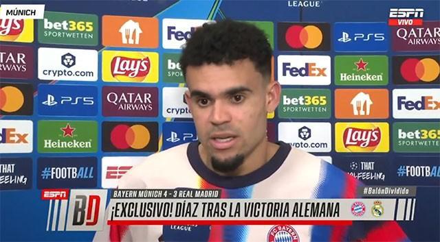 在拜仁主场与皇马的欧冠1/4决赛次回合中,迪亚斯在终场前打入关键远射,帮助球队最终以4-3击败皇马,以总比分6-4晋级四强。赛后,这名哥伦比亚射手接受了西班牙Movistar+的采访。