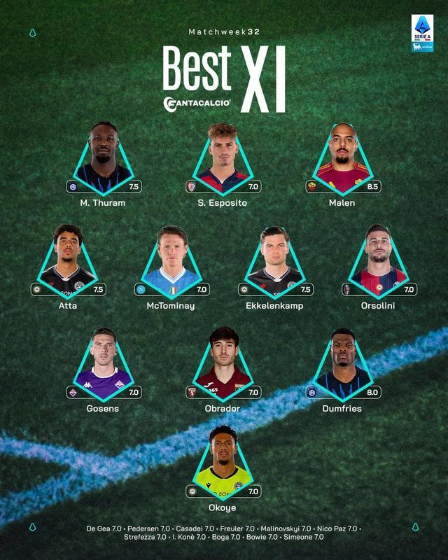 意甲第32轮最佳阵容: