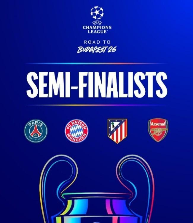 至此本赛季欧冠四强全部出炉,英超、西甲、法甲和德甲各有一支队伍入围。半决赛拜仁将同巴黎 圣日耳曼交手,阿森纳将会面对马德里竞技队。两回合半决赛分别于4月29/30日以及5月6/7日上演。