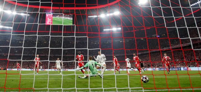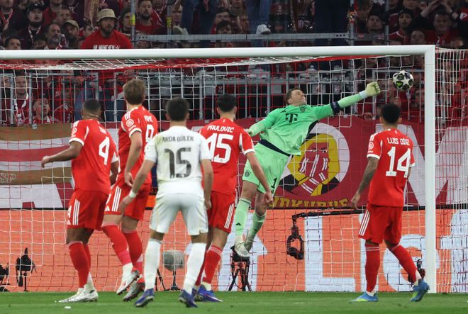 某种程度上,这场比赛和首回合没什么不同。拜仁掌控局面,但机会是双方都有。只不过这次,皇马射门准头更足——一次禁区前沿的任意球,居莱尔左脚兜出一道弧线,诺伊尔反应慢了,腿也沉了,等球已经进了球王他才碰到球。