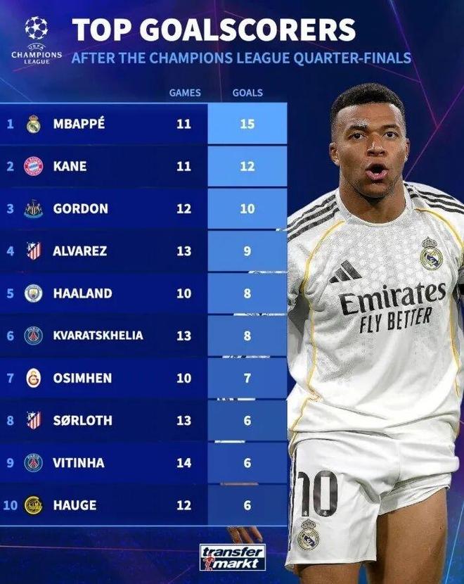 然而十年过去了,他依然是那个为了梦想不断奔波的“天才”。数据统计显示,姆巴佩在欧冠赛场已出场98次,打入70球,是欧冠历史射手榜前10名中唯一未曾夺冠的球员也是达成这个成就最年轻的一员(比梅西还要小了的)。本赛季他以15球领跑欧冠射手榜,但球队的出局使其冲击C罗单赛季进球纪录的希望也随之破灭的。