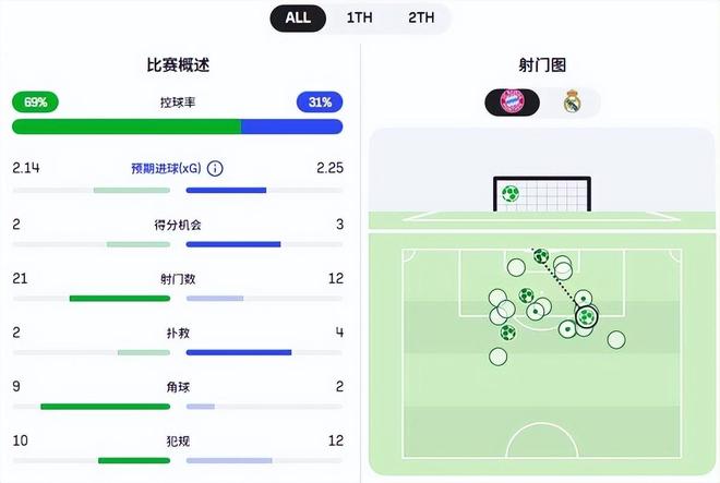 本场比赛虽然射门数是拜仁领先,不过绝佳机会上皇马占优,预期进球同样是皇马更多。考虑到拜仁的预期进球有一部分是靠射门总数堆出来的,皇马的进攻质量显然更高。