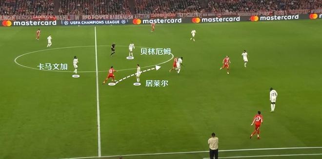卡马文加的第一张黄牌,穆西亚拉持球过人时,居莱尔在正面毫无防守能力。这时候贝林厄姆没有补位,因为他不会。再加上贝林厄姆又要兼顾防守,又要组织推进和进攻,他也的确是累坏了。