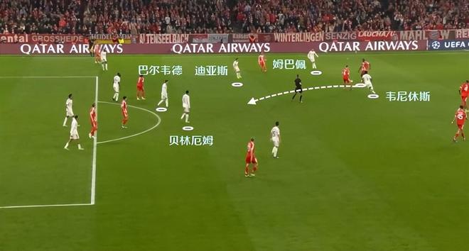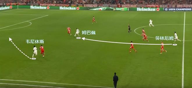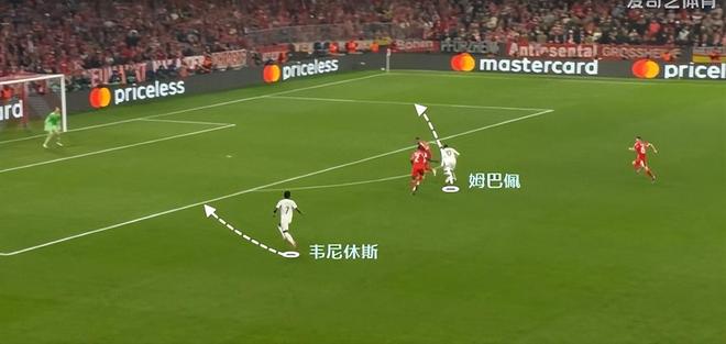 拜仁整体队形太高,纵深空间留的很大。姆巴佩突然转型猎豹,利用自己的冲刺,接应到了韦尼休斯的妙传,让皇马取得半场3比2的领先,追平了两回合总比分。