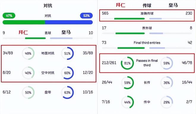 皇马虽然是一支西甲球队,不过他们的对抗一直属于上乘。面对来势汹汹的拜仁,皇马放弃了一部分的控球权,他们追求犀利的反击,所以拜仁在进攻三区的传球次数和成功率远高于皇马,但皇马通过反击可以更有效地打击拜仁的腹地。