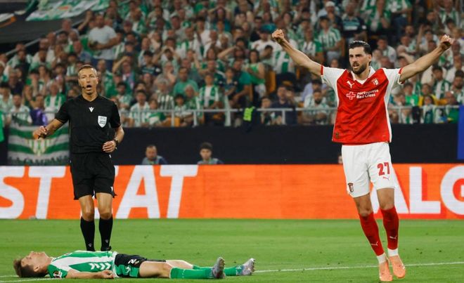 下半场易边再战。第49分钟,布拉加扳平比分!奥尔塔开出任意球,门将出击失误,卡瓦略抢点头球顶进。3分钟后,特克纳兹制造点球机会。奥尔塔主罚点球,骗过门将稳稳罚进。布拉加竟然反超比分,太不可思议了!第74分钟,让-巴普蒂斯特轰出一脚世界波,扩大比分。最终,皇家贝蒂斯2-4输给布拉加,惨遭淘汰。真是神剧情!佩莱格里尼不敢相信,皇家贝蒂斯竟然在2球领先的情况下连丢4球崩盘耻辱落败。