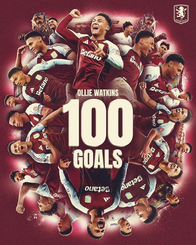 据统计,这是沃特金斯维拉生涯各项赛事第269次出场打入的第100粒进球。