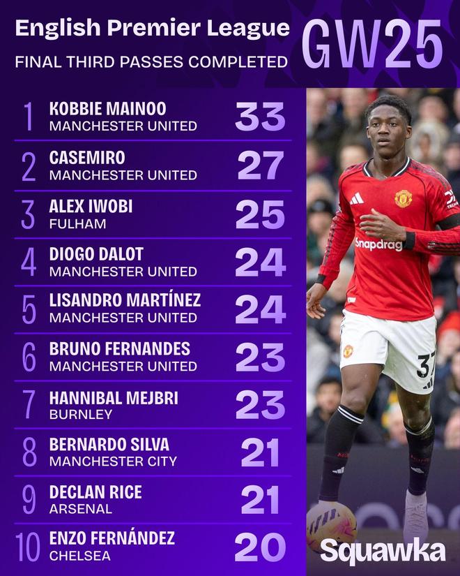在曼联2-0战胜热刺的比赛中,曼联中场科比-梅努表现非常出色,其数据非常亮眼,33次进攻三区成功传球是本轮英超最多,还送出一次助攻。