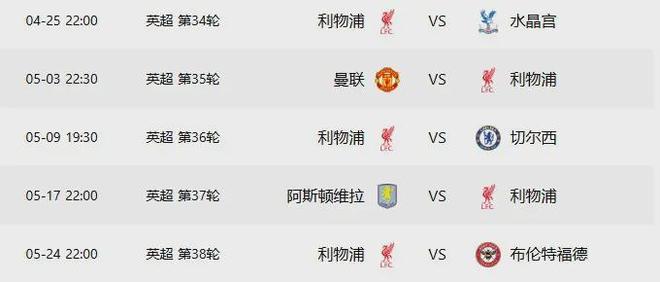 利物浦最后五轮的对手是:水晶宫(客)、曼联(主)、切尔西(客)、维拉(主)、纽卡斯尔(客)。五场比赛四个客场,三个对手是争夺欧战资格的直接竞争者。