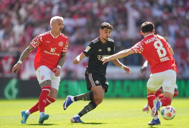 比赛第15分钟,拜仁丢球了!佐野海舟在禁区右侧起球传中。科尔直接凌空射门,皮球弹地后钻入球门。美因茨获得梦幻开局。第21分钟,贝克尔在右侧起球传中,皮球直接奔向球门。乌尔比希单掌把球扑了出去。8分钟后,美因茨再次进球。美因茨踢出犀利的反击,内贝尔在门前抓住机会补射破门。