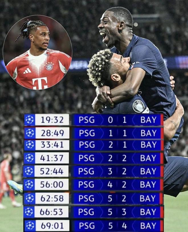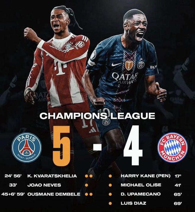 真正把这场比赛送进历史名场面的是下半场那波15分钟暴走。第56分钟和第58分钟,克瓦拉茨赫利亚和登贝莱双双梅开二度,比分来到5比2,这已经不是正常强强对话,而是卫冕冠军当着全欧洲的面,给拜仁做了一次公开处刑。