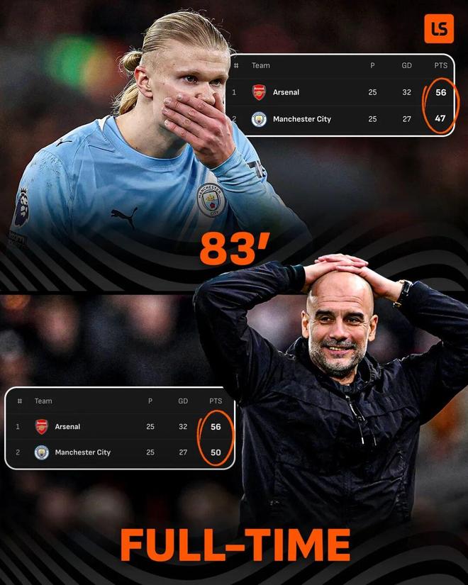 如果落后9分,那会是一个令人生畏的差距,但曼城现在有了真正的希望,他们能在未来几周内将阿森纳拉回追逐圈。阿森纳必须在周四晚客场战胜布伦特福德,这绝非易事。而随着曼城在周三晚主场迎战富勒姆,分差可能会缩小至3分。