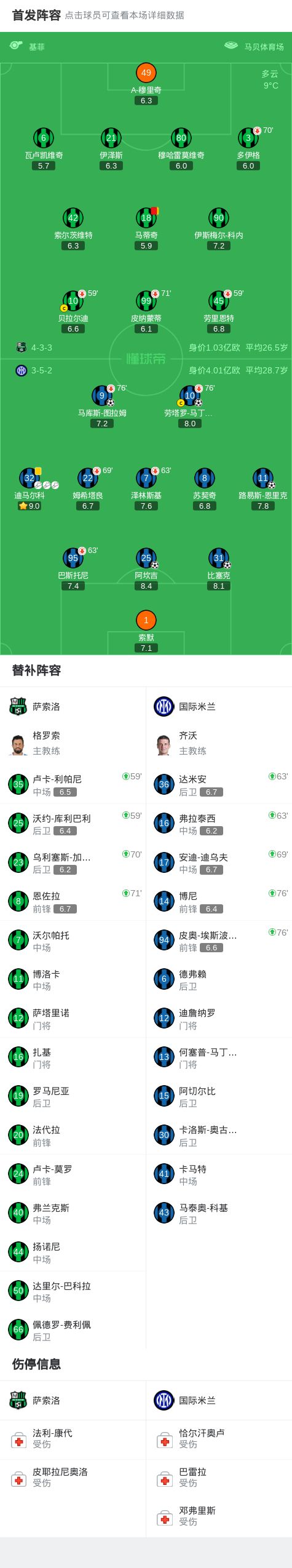 北京时间2月9日意大利足球甲级联赛第24轮,萨索洛主场迎战国际米兰。比赛上半场迪马尔科角球找到比塞克抢点头球破门先拔头筹,之后迪马尔科再送助攻,小图拉姆包抄垫射完成破门,劳里恩特越位在先,索尔茨维特的进球被吹无效。下半场劳塔罗禁区胸部停球后扫射破门,随后迪马尔科助攻帽子戏法,阿坎吉头球破门完成联赛首球,之后马蒂奇对裁判表达不满被两黄变一红罚下,比赛尾声路易斯-恩里克凌空抽射远角破门也攻入联赛首球。全场战罢,最终国际米兰客场5-0大胜萨索洛继续领跑积分榜。
