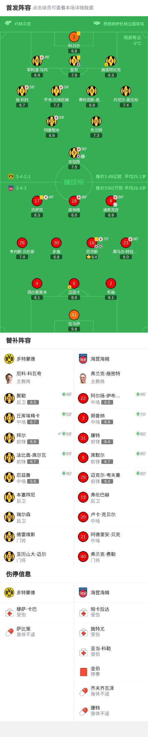 第45+5分钟,马内突然受伤,之后尼许斯破门,海登海姆1-1多特