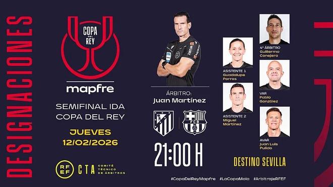 2月11日,西班牙足协官方公布了国王杯半决赛首回合马竞vs巴萨的裁判安排,胡安-马丁内斯将担任主裁。