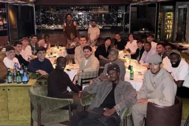 本次晚宴,皇马一线队球员悉数到场,包括受伤的米利唐、罗德里戈与贝林厄姆。据悉,此次晚宴由维尼修斯与姆巴佩共同发起,巧合的是,两人都是晚宴举办场地的专属会员。晚宴结束后,巴西前锋还特意在社交平台上分享了一张合影,照片中包含24名皇马球员。