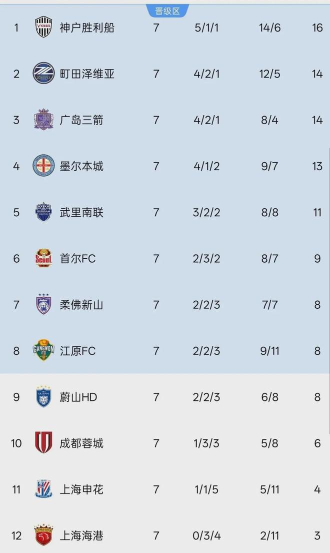 7轮过后的积分榜,由于本轮均未取胜,3支中超球队仍旧牢牢占据着倒数3个位置。成都蓉城积6分排在倒数第3,申花仅有4分排倒数第2,上港则继续排名垫底。其中,两支上海球队与第8名的分差已经超过3分,在联赛阶段仅剩1轮的情况下已无法跻身晋级区,提前1轮被淘汰出局。
