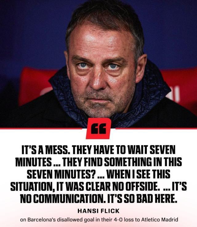 巴萨客场0比4惨败于马竞脚下,唤醒了多项耻辱记录:这是2023年4月国王杯半决赛之后,巴萨首次净负4球;也是2020年8月欧冠1/4决赛之后,巴萨首次上半场丢4球,当时巴萨最终2比8输给拜仁,后者的主帅正是弗利克。