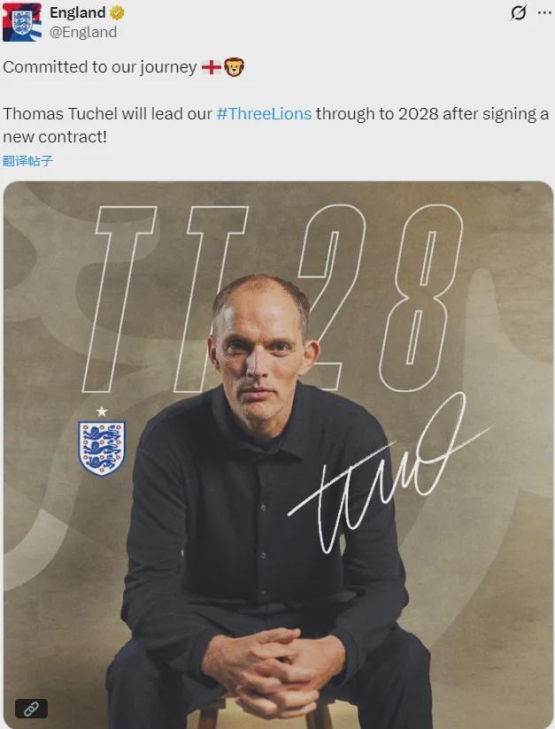 官方:英格兰宣布和图赫尔续约到了2028年。