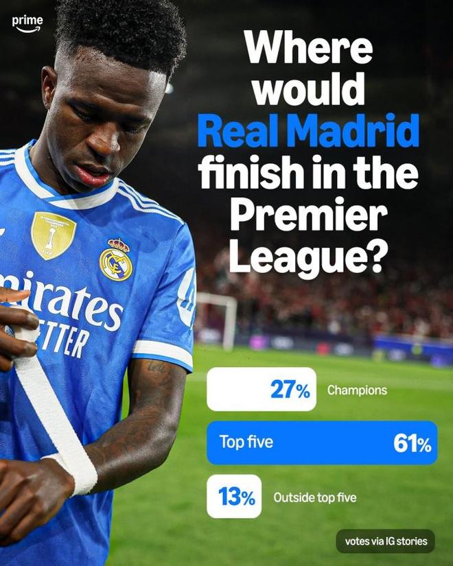 皇马作为足坛的顶级豪门,在西甲联赛大部分时间里都是在和巴萨竞争联赛冠军的位置,如今英超联赛关注度提升,影响力和收入都是足坛第一联赛,自然也有球迷好奇皇马如果去到英超能排在第几的位置。转播商亚马逊发起了一次球迷调查,就问了球迷这个问题,现在的皇马去英超能排在第几?从投票结果来看,只有27%的球队认为皇马能够夺冠,61%的球迷认为皇马能够排在前5,也有13%的球迷认为皇马拿不到欧冠名额。