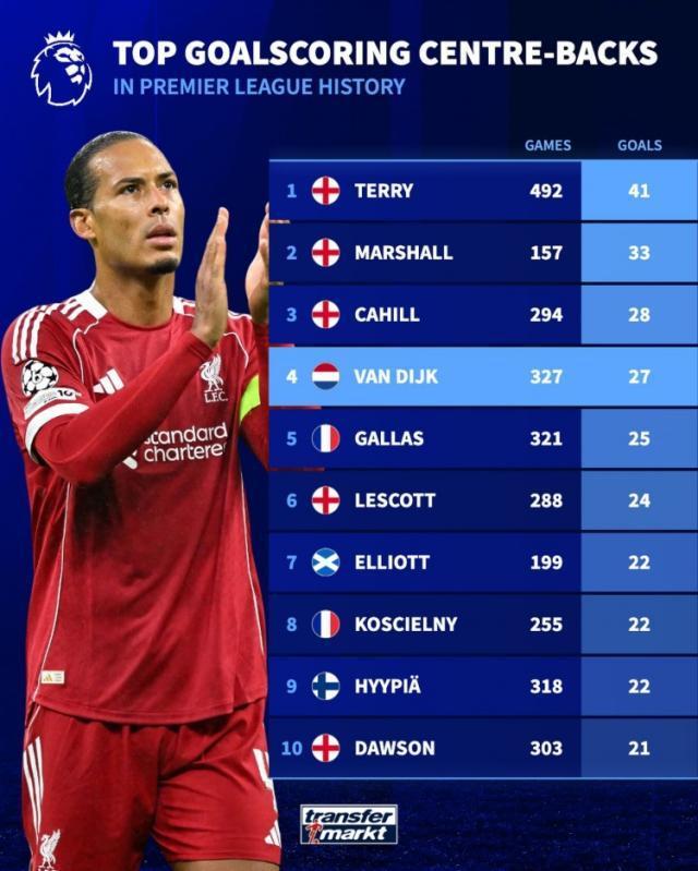 德国转会市场统计了英超历史上中后卫进球数据排名,约翰·特里41球居首,范戴克27球第四。
