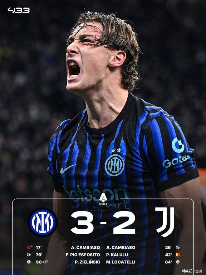 意甲第25轮焦点战,最终国际米兰主场3-2尤文图斯,各项赛事6连胜,8分优势领跑积分榜。路易斯-恩里克造成坎比亚索乌龙,坎比亚索将功补过抢点破门扳平,卡卢卢两黄变一红,皮奥-埃斯波西托破门,洛卡特利扳平,泽林斯基绝杀。