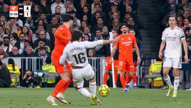 第61分钟前后,皇家社会连续两次近在咫尺的射门,均被库尔图瓦神奇扑出!第90分钟,皇家马德里利用定位球的机会,维尼修斯禁区再度破门,但是只可惜稍稍越位,遗憾被吹掉,错失帽子戏法。最终全场比赛结束,皇家社会完败皇马。