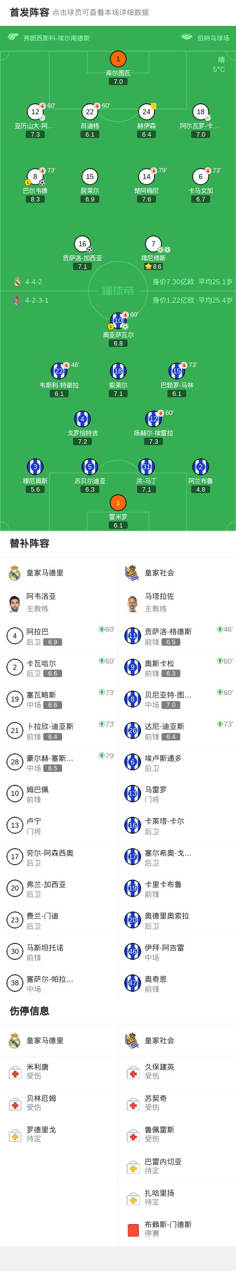 第59分钟,皇马换人,阿拉巴和卡瓦哈尔替补登场