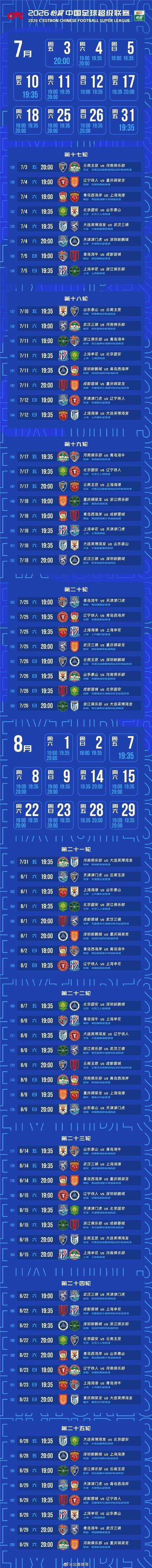 同样值得关注的是,2026赛季中超联赛仅有3轮安排了周中赛,分别是第7轮(4月21日、22日)、第10轮(5月5日、6日)、第13轮(5月19日、20日)。如此安排的另一个重要原因,是海港、国安、申花将从下半年开始分别参加2026-2027赛季亚冠两级赛事(目前仅成都蓉城仅存晋级2025-2026赛季亚冠精英联赛淘汰赛的理论可能)。中足联在赛程安排方面要兼顾这几支球队国际赛事竞争利益,因而没有在联赛下半程安排周中赛。