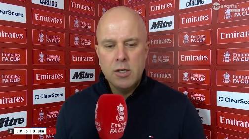 英格兰足总杯第4轮,利物浦主场3-0战胜布莱顿,利物浦主帅斯洛特赛后接受了TNT体育的采访。