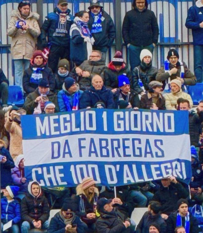 这些科莫球迷打出的横幅上写着“当1天的法布雷加斯胜过当100天的阿莱格里”,显然这是对阿莱格里执教的球队倾向于防守的球风的讽刺。