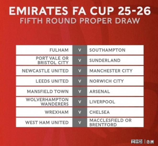 足总杯第五轮抽签仪式结束,曼城对阵纽卡斯尔,阿森纳面对低级别球队曼斯菲尔德,利物浦VS狼队,切尔西面对雷克瑟姆,富勒姆对阵南安普顿,利兹联对阵诺维奇,等等。
