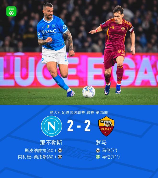 北京时间2月16日意大利足球甲级联赛第25轮,那不勒斯主场对阵罗马。上半场,萨拉戈萨助攻,马伦破门。随后,斯皮纳佐拉远射破旧主。下半场,韦斯利造点,马伦主罚命中。焦瓦内助攻,阿利松-桑托斯扳平比分。全场比赛结束,那不勒斯2-2罗马。