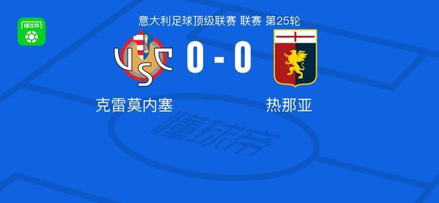 北京时间2月15日意大利足球甲级联赛第25轮,克雷莫内塞主场迎来热那亚的挑战。全场比赛结束,两队均未攻破对方球门,最终克雷莫内塞0-0战平热那亚。